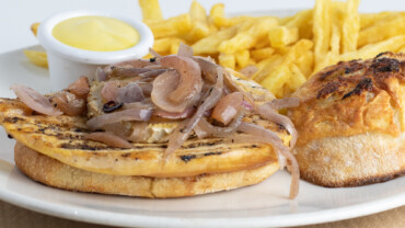 Crujiente empanado con queso cheddar, bacon ibérica y huevo frito.